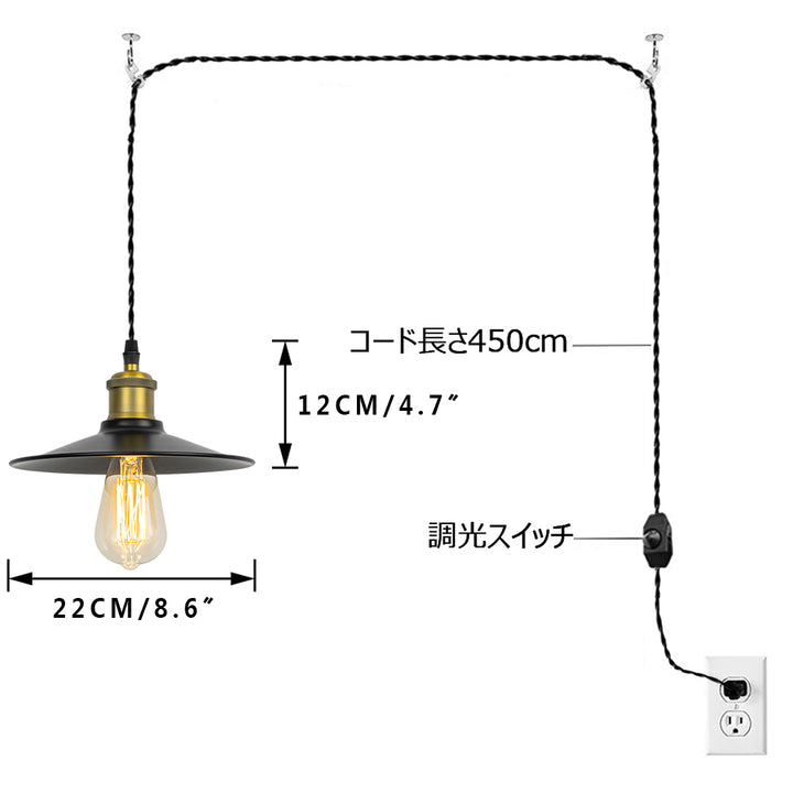 ・取付:コンセント式 ・コード長さ:450cm、コードに調光スイッチ付き ・口金:E26 (電球別売り)、100Wまで対応、 調光対応のフィラメント電球を合わせて使ってください。