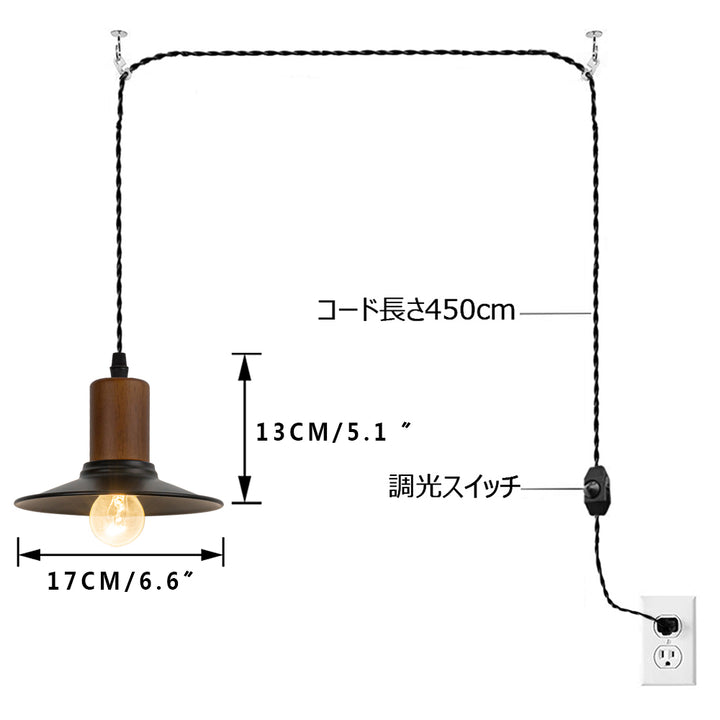 ・取付:コンセント式 ・コード長さ:450cm、コードに調光スイッチ付き ・口金:E26 (電球別売り)、100Wまで対応、 調光対応のフィラメント電球を合わせて使ってください。
