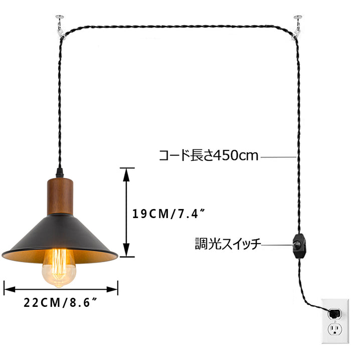 ・取付:コンセント式 ・コード長さ:450cm、コードに調光スイッチ付き ・口金:E26 (電球別売り)、100Wまで対応、 調光対応のフィラメント電球を合わせて使ってください。