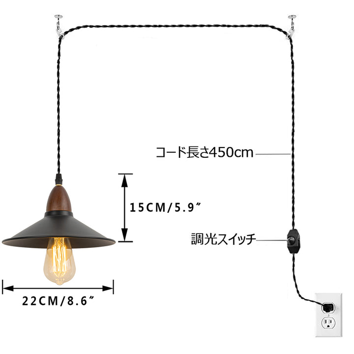 Installation: Plug-in type Cord length: 450cm, with dimmer switch on cord Socket: E26 (bulb sold separately), supports up to 100W. Please use with a dimmable filament bulb.