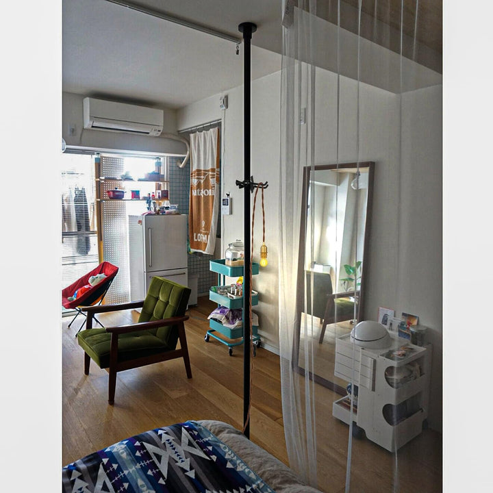 • 突っ張り棒に取り付けられるので、自由な場所に省スペースで照明を設置できます。突っ張り棒に取り付けられるフックが付属です。吊り下げることで設置しています。