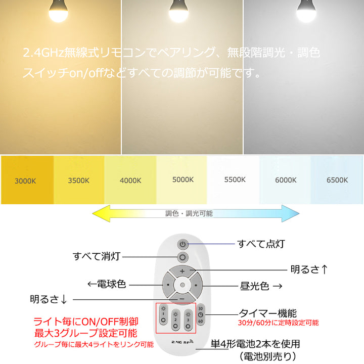 - 【 調光&調色機能】· 明るさを調節:明るさは5%~100%調光可能です ·色温度は2700K~6500K、無段階調節可能(電球色、自然光、昼光色)、美しい光×静音性に優れた調光によって、より快適な光のライフスタイルを実現します。(リモコン付属、単4形電池2本を使用、電池別売り)