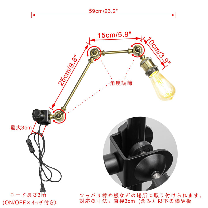 - 取付方法:取り付け方向:縦・直径3cm以下(3cm含み)の棒や板に取付られます。ネジで簡単にしっかり固定することが可能です。電源はコンセント式、3メートルのコード付き、コードにON/OFFスイッチも付いてあります。【口金】:E26(LED電球付属-調光調色対応)