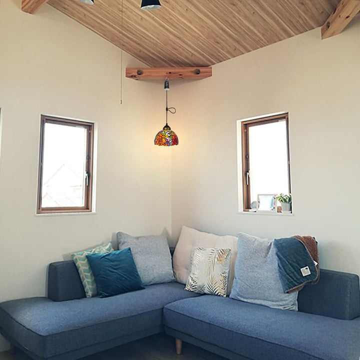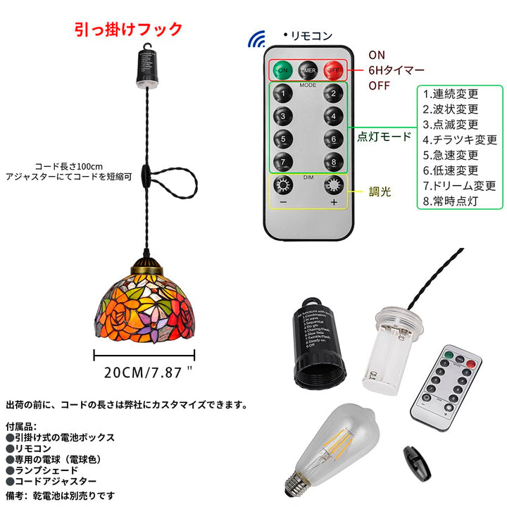 FSLIVING ペンダントライト 引掛けフック式 ティファニー ティファニーランプ チェーン付属 電池式 電池ボックス 吊り下げライト 雰囲気 リモコン付き 調光可 タイマー機能付き 8つの点灯モード選択可 賃貸照明 TB3144DCB-X258
