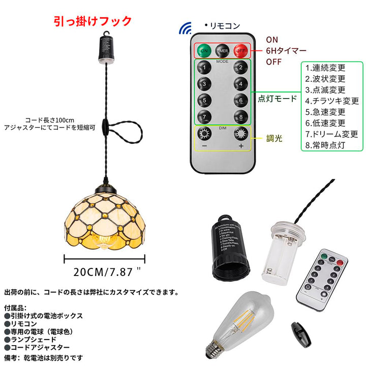 FSLIVING ペンダントライト 引掛けフック式 ティファニー ティファニーランプ チェーン付属 電池式 電池ボックス 吊り下げライト 雰囲気 リモコン付き 調光可 タイマー機能付き 8つの点灯モード選択可 賃貸照明 TB3144DCB-X272