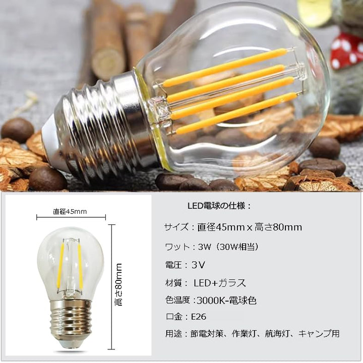 - 数量:2個パック LED電球 (電球のみ、ライトソケット別売り) 商品仕様:入力電圧:3.7V(低圧専用)、 電力:LED 3W(200ml) 発光色:電球色2700k、 口金:E26