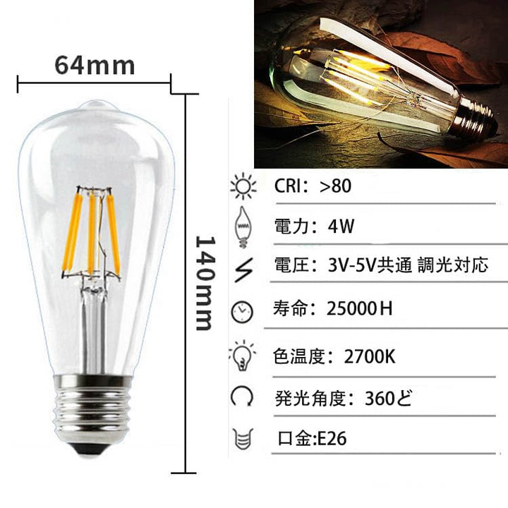 - 口金:E26(低圧専用の電球付属、4W、電球色2700k) スイッチ付き。 コード長さ約1メートル。 ※防水構造にはなっていない。浴室や、雨天屋外では使用不可。
