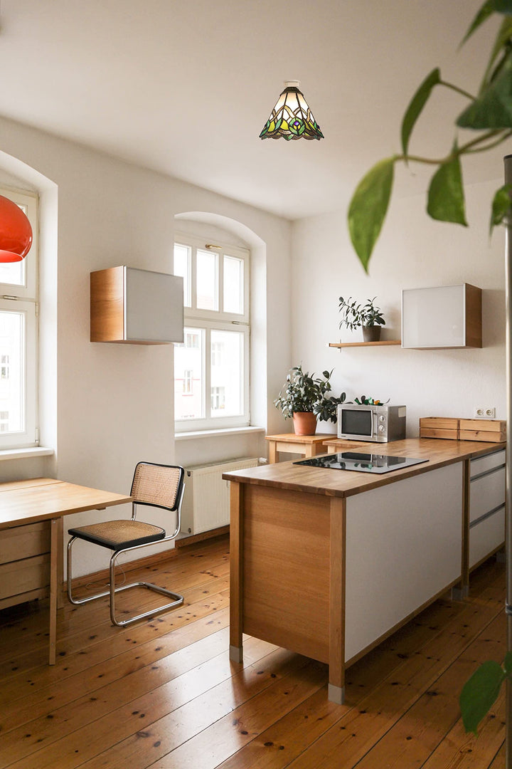 - コロンとした丸いフォルムがキュートな1灯シーリング。カラフルなガラスが特徴です。