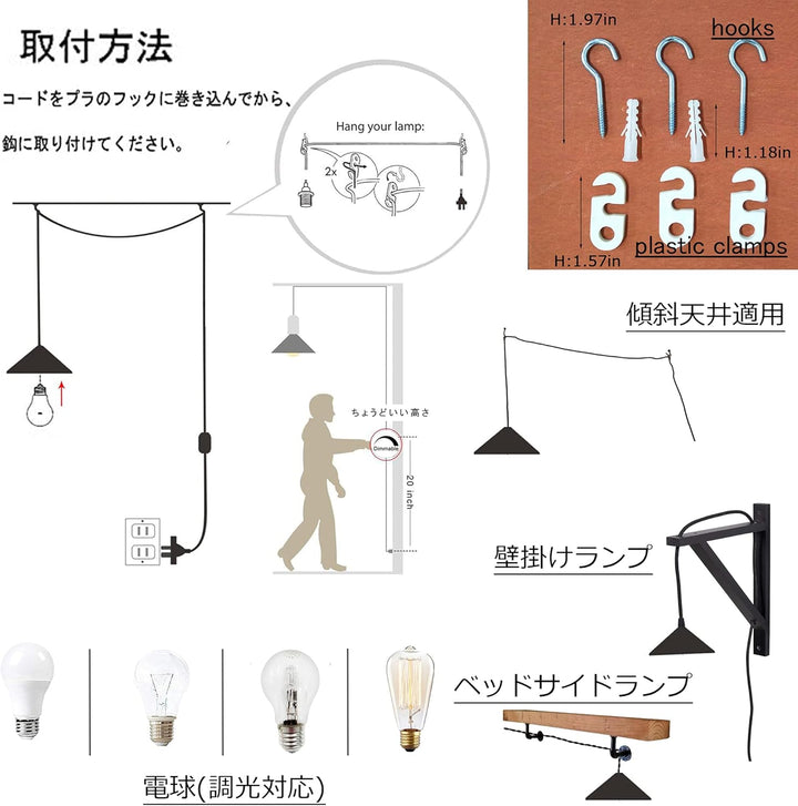 - コンセント式、調光可、レトロなブラックコード付。電源工事なしで簡単に取り付け可能、照明面積:約3-5平方メートル